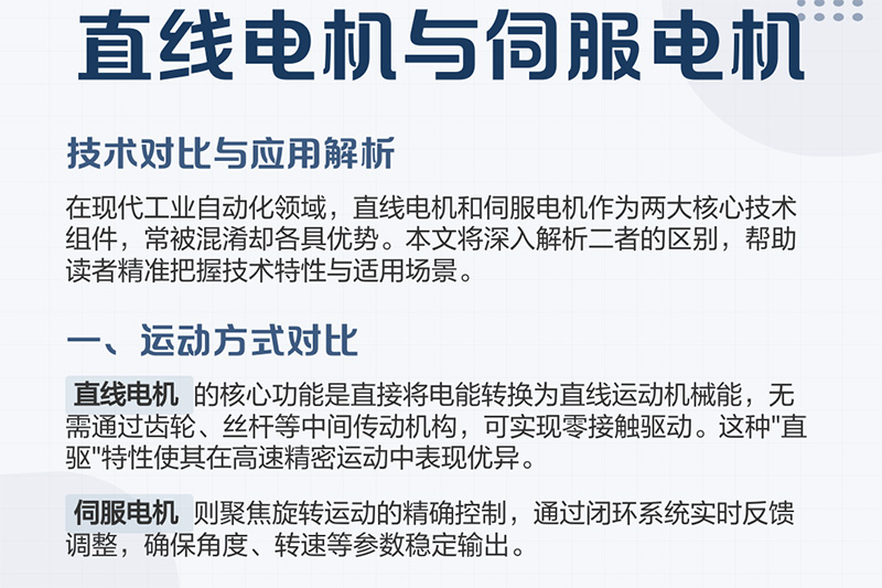 直线电机和伺服电机是现代工业中常见的两种电动机械设备。以下是它们之间的不同处:
